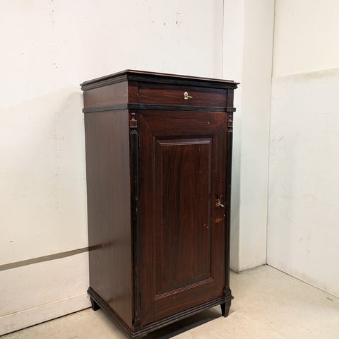 Kuvan upea kunnostettu antiikki kaappi myytävänä. Avain tallessa ja lukitus toimii ovessa. Laatikon lukko ei toimi kunnolla ja avain toimii vetimenä. Sisusta ja tausta maalattu. Yksi jalka kokonaan vaihdettu. Rakenteeltaan kaikin puolin tukeva. Pintaan jätetty kaunis ajan patina. Ei hajuja.
