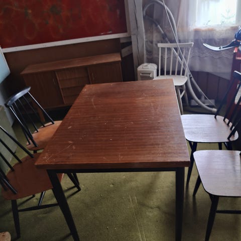 Pyöreä ruokapöytä neljällä pinnatuolilla. Samaa sarjaa. Pöydän halkaisija 1m. Tuolin istumakorkeus43cm puh.nolla505477346
