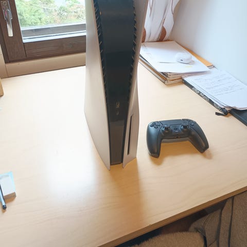 Sony PlayStation 5 pelikonsoli. Kotikäyttöön tarkoitettu pelilaite. Konsolissa on levykeasema fyysisiä pelejä ja elokuvia varten sekä useita liitäntöjä, kuten USB-portteja ja HDMI-liitäntä. Soveltuu PlayStation 5 -peleille ja yhteensopiville oheislaitteille, kuten ohjaimille ja kuulokkeille.
