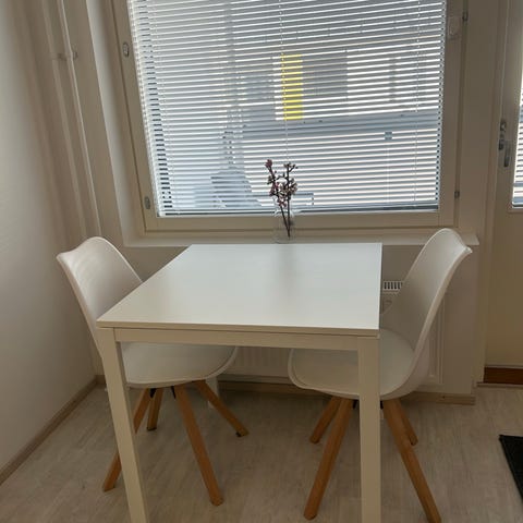 Pöytä on Jyskin valkoinen Jegind pöytä. Pöydän halkaisija on 105cm. Pöydän reunassa on pari kolhua (katso kuvat).
