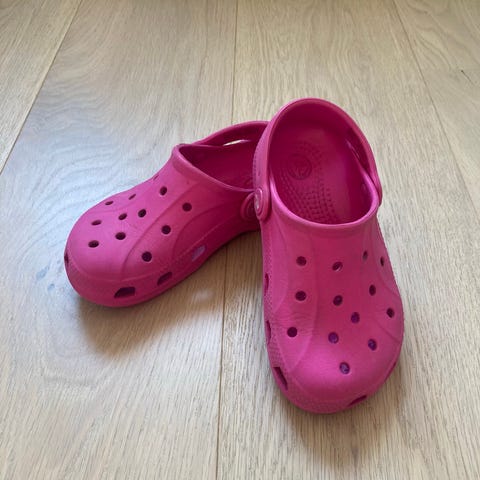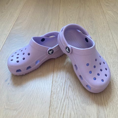 Liilat Crocs sandaalit, pinnassa kultaista kimalletta. Kimalle kulunut kärjestä, vastaa n. kokoa 28