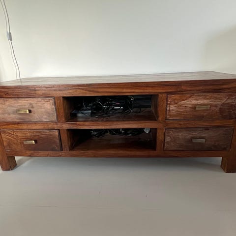 Puinen TV-taso, kaapelireitit ylimmällä ja alimmalla hyllyllä. Siistit lasiovet, ja pohjassa pyörät. Hyvässä kunnossa, sopii hyvin näin tai vaikka uudelleenmaalattavaksi. Mitat 104 × 65 × 57cm.