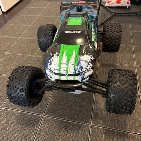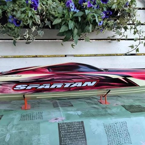 Traxxas Spartan RC-vene punaisella ja valkoisella rungolla. Kokonaispituus 103 cm. Huippunopeus vakiopotkurilla mitattu 84 km/h lisävarusteisella GPS:llä ja 3S-akuilla. Naarmuton pohja, eli ei koskaan ajettu kiville tai päin rantaa. Katteessa GoPro-kiinnike. Veneessä on sähkökäyttöinen moottori ja vesijäähdytys, peräsin ja potkuri takana sekä sisällä elektroniikat ja akkupaikat hihnakiinnityksillä. Sopii radio-ohjattavaksi veneeksi esimerkiksi järvi- ja jokikäyttöön. Perässä lisävarusteinen ripa estämässä veden nousua kannelle peruutettaessa. Akkuja ja laturia voi kysellä erikseen, jos on tarvetta.