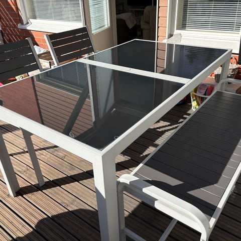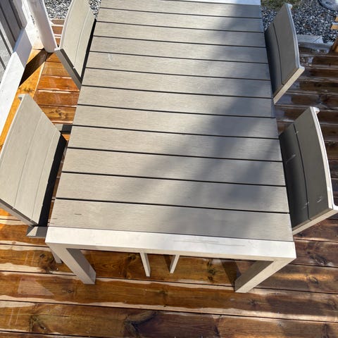 Terassi kaluste,jossa kaksi tuolia ja pikku pöytä keskellä.Muuten oikein hyvässä kunnossa paitsi molempien selkänojat vähän kärsineet (näkyy kuvissa).Ei haittaa käyttöä kuitenkaan eikä juuri näy,kun laittaa tyynyn eteen tms.Toisen istuin tyynyn toinen puoli vähän likainen,mutta siitäkin toinen puoli on puhdas kyllä!Leveys mitattuna leveimästä kohdasta noin 137cm.Tule hakemaan lamminpäästä pois kuljeksimasta 15e