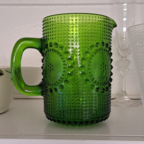 Keramiikka kannusetti, jossa kaksi vihreää kannua. Korondilaista keramiikkaa (Korond Ceramic Pitcher), joka on perinteistä unkarilaista kansantaidekeramiikkaa Transilvaniasta. Molemmissa kannuissa on kaatonokka ja korvakahva sekä kohokuvioitu nappimainen koristelu kyljissä. Sisäpinta on lasitettu tummemman vihreäksi. Pohjat ovat lasittamattomat. Sopii esimerkiksi maidon, kastikkeen tai muiden juomien ja ruokien tarjoiluun sekä keittiön käyttö- tai koriste-esineiksi.