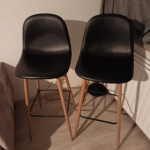 Musta baaripöytä, sekä kaksi valkoista baarituolia Jyskistä.
