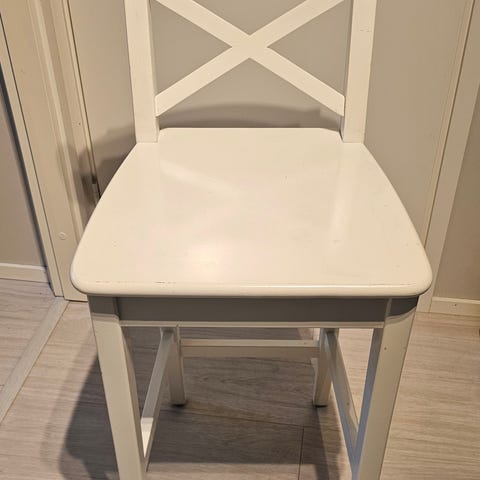 Tuolien istuinosan kork. n. 76 ja lev. n. 40, selkänoja n. 30. Tuoleissa käytönjälkeä.