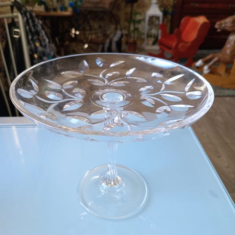 Antikt serveringsfat i kristall i mycket gott skick. Ytorna snygga, glänsande, hela. Fatet har en kant.