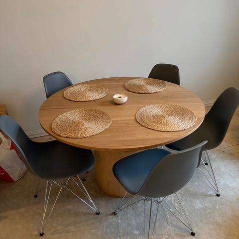 Valantin kaunis ruokapöytä, jossa yhdistyy saarniviilu ja musta metallirunko. Tavanomaista leveämpään (120 cm) pöytään mahtuu mukavasti kattaus ja tarjoiluastiat ja sen ääreen mahtuu mukavasti kahdeksan henkilöä ja tarpeen tullen kymmenen. Ostettu Vepsäläiseltä vuonna 2015. Käytön jäljet ja kuluma näkyy kuvissa.