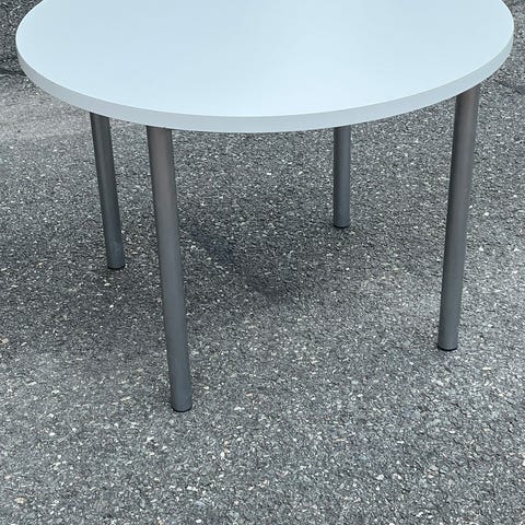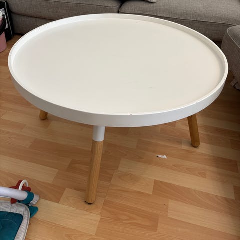 Valkoinen Ikean sohvapöytä. Halkaisija 90cm, korkeus 48cm. Muutoin maalipinta ok, paitsi yhdessä kohdassa reunaa kuluma (kuva 3). Nouto Herukasta. Maksu mp/käteinen.