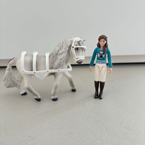 Schleich appaloosa tamma ja varsa. Ukkeli ja pitkä raippa. Ukkelilla on koru kädessä, jonka saa pois. Ei ole käytetty oikeastaan yhtään eikä ole mitään jälkiä. Saatu vasta vähän aikaa sitten. Nämä ovat setistä ”schleich Lisas tournament training”.