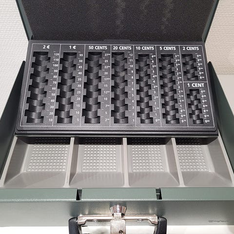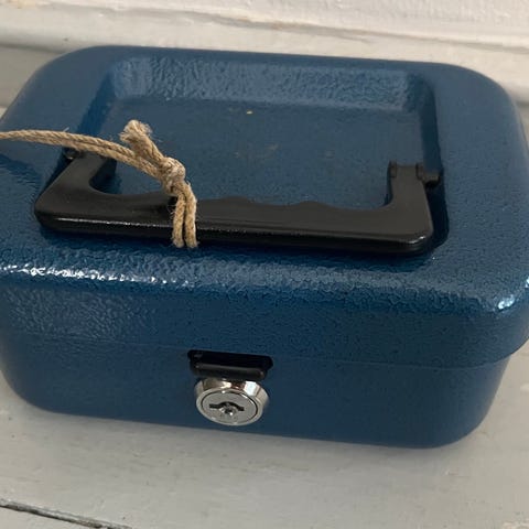 Sininen metallinen lukittava kassalipas kahdella avaimella.