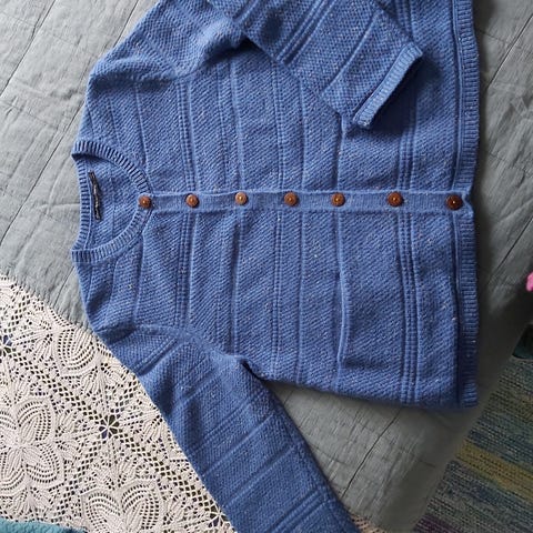 Neuleen reunus on edestä ja niskasta paikoitellen kulunut, niskapuolella tehty pieni korjaus käsin. Näitä tästä lisäkuvat.