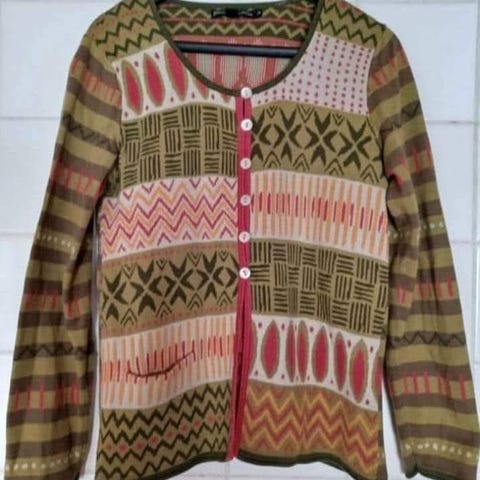 Gudrun Sjödén -neuletakki koko L/XL. Materiaalina 70% puuvilla, 30% villa. Neuleessa on musta-vaaleanharmaa väritys, lehtikuvio ja värikkäät reunukset. Hihoissa tupsukoristeet. Malli on avoin, edessä yksi nappi.
