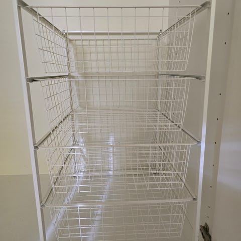 Metallinen valkoinen korihyllykkö, jossa useita ulosvedettäviä verkkokoreja. Sopii esimerkiksi vaatteiden, tekstiilien tai pientavaroiden säilytykseen vaatehuoneessa, varastossa tai kodinhoitotilassa. Runko ja korit ovat metalliverkkoa, mikä mahdollistaa hyvän näkyvyyden ja ilmanvaihdon säilytettäville tavaroille.