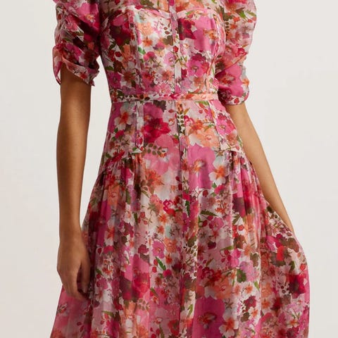Ted Baker juhla- tai cocktailmekko naisille. Koko XS. Mekossa on monivärinen, kukkakuvioinen kuosi ja lyhyet hihat. Materiaali on polyesteriä. Takana on vetoketju pukemisen helpottamiseksi. Sivuissa taskut. Sopii juhla- ja tilaisuusmekoksi. Siisti ja hyväkuntoinen.