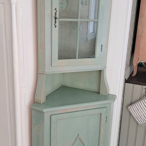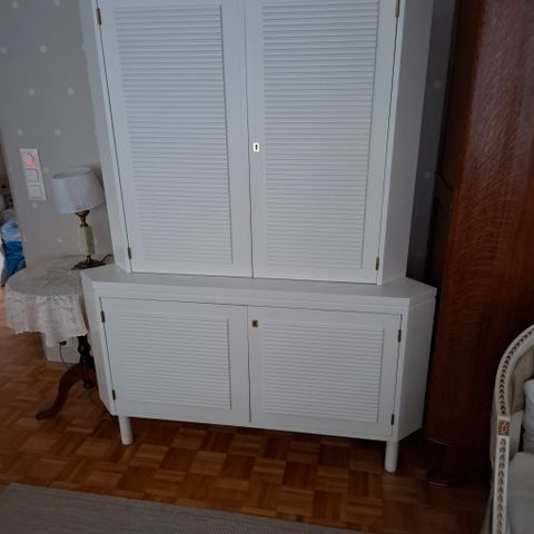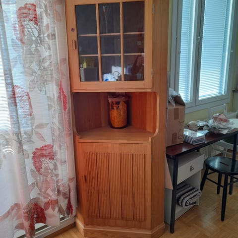 Yläkaapissa lasiovet ja alhaalla umpiovet.