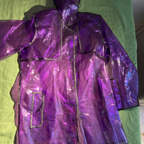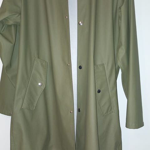 Hyväkuntoinen vihreä sadetakki. Pituus 103 cm, hiha hupunreunasta 70 cm, kainalo - kainalo edestä 52 cm. 2 taskua. Pienehkö koko 42.