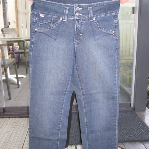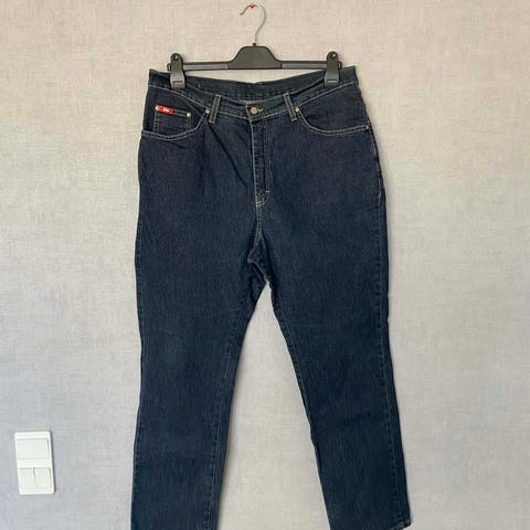 Koko 36/30". Hieman joustavaa materiaalia, ei jäykkää farkkuja.