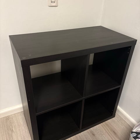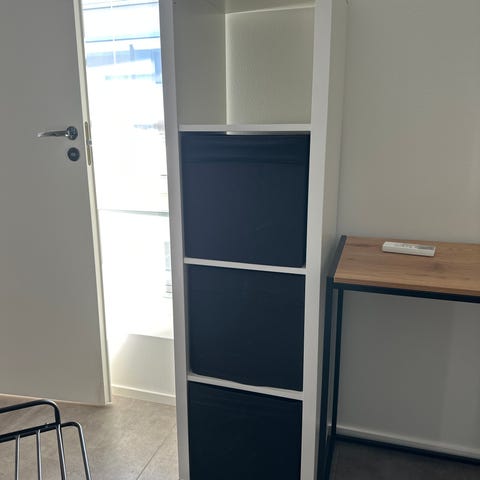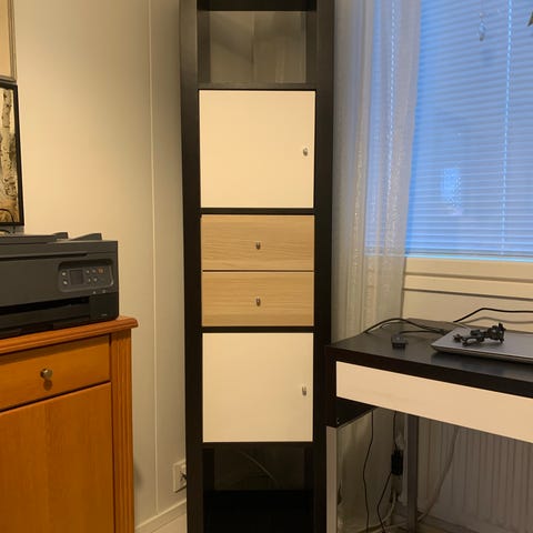 IKEA hyllykkö, kapea ja korkea malli. Valkoinen runko ja useita avoimia lokeroita, joissa osassa mustat ovet tai laatikot. Soveltuu esimerkiksi kirjojen, kansioiden ja pientavaroiden säilytykseen kotona tai toimistossa. Hyllykkö vie vähän lattiatilaa ja mahtuu hyvin kapeaan tilaan, kuten ikkunan viereen tai nurkkaan. Vanhempaa paksua Kallax-sarjaa (50mm). Vain nouto.