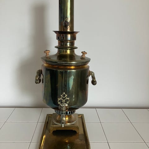 vintage-tyylinen viininilmaisin, joka koostuu etsatusta lasikarahvista ja taotusta metallitelineestä.