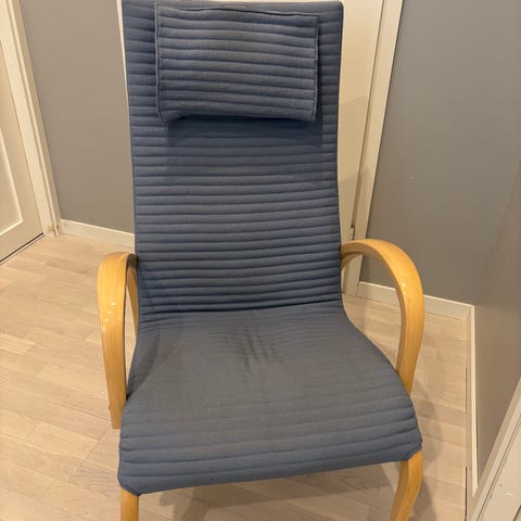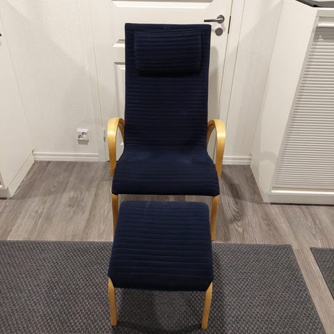 Askon valmistama Harlekiini-mallin nojatuoli ja rahi, suunnittelija Markku Pakkanen