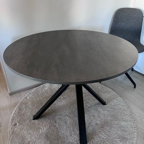 Vuoden käytössä ollut ruokapöytä. Pöydän jaloissa hieman kulumaa.