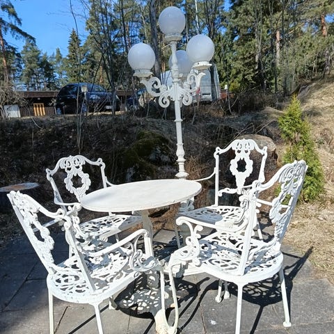 Metallinen pöytä, metallinen tuoli, vintage, valotarauta, takorauta