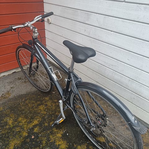 Naisten hybridipyörä. Kunnoltaan hyvä. Takajarru ja vaihteet vaativat hienosäätöä. Mukaan myös nastarenkaat. Runkolukko ja yhdistelmäpolkimet. Runkokoko 21.
