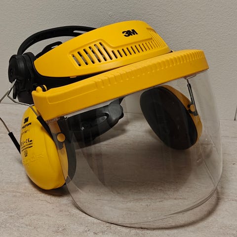 Petzl Vertex -suojakypärä ja 3M Peltor Optime I -kuulosuojaimet. Vertex-kypärä on valkoinen suojakypärä, jonka koko on 53–63 cm. Kypärä on tarkoitettu pään suojaamiseen työssä ja muissa tilanteissa, joissa tarvitaan iskunkestävää suojaa. 3M Peltor Optime I -kuulosuojaimet ovat keltaiset kupumalliset kuulosuojaimet, jotka vaimentavat ympäristön melua.