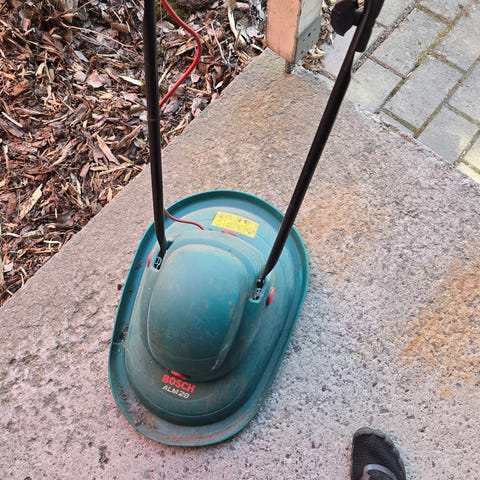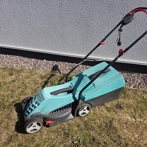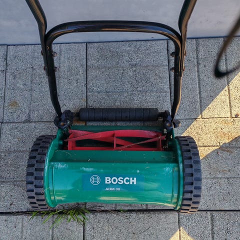 Bosch käsikäyttöinen ruohonleikkuri, jossa sylinteriterä ja työntöaisa. Leikkurissa on irrotettava kerääjä. Kaksi kesää käytetty, hyvässä iskussa.