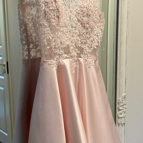 Mekko on vaaleanpunainen ja valmistettu satiinista. Yläosa on pitsikoristeinen, V-pääntiellä ja ohuilla olkaimilla.