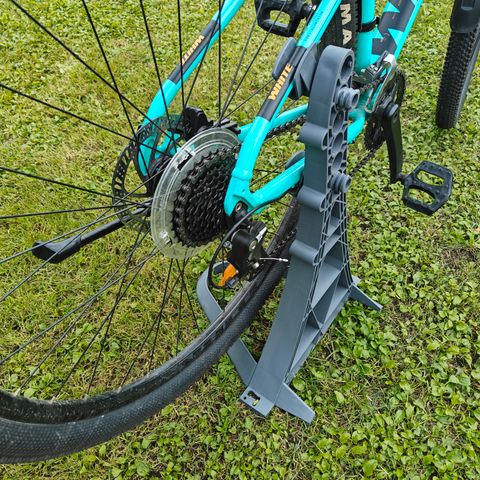 Metallinen polkupyörän huoltoteline. Telineessä on kolmijalkainen jalusta, korkeussäädettävä runkoputki sekä pyörän rungon kiinnitykseen tarkoitettu kiristettävä pidike. Lisäksi telineessä on pieni irrotettava tai säädettävä tarvikekaukalo työkaluille ja pienosille. Soveltuu polkupyörän huoltoon ja säätöihin kotikäytössä tai harrastekäytössä.