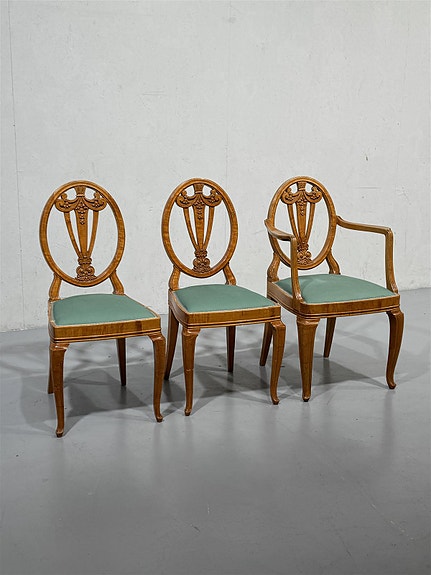 Kuusi klassista tuolia, joissa on vihreä verhoilu ja tummat puukehykset. Tuolit ovat kevyitä ja niissä on koristeelliset selkänojat.