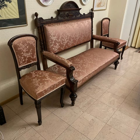 Näyttävä kahdeksankulmainen pöytä. Saatu perintönä vuonna 1956, jolloin ollut jo vanha & kertaalleen entisöity. Tyylillisesti edustaa 1920-1930-luvun puusepäntyötä (Art Deco/ funkkis). Kukan muotoinen/aaltoreunainen, ei tule vastaan joka päivä.