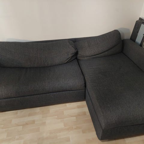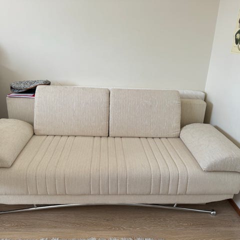Levitettävä sohva säilytys tilalla. Vähän repeymää divaaniosuuden saumassa ja sohvatyynyn kääntöpuolella. Juotavaa kaatunut levitettävälle osuudelle, putsattu, mutta jälkiä jäi näkyviin (näkyy kuvassa).