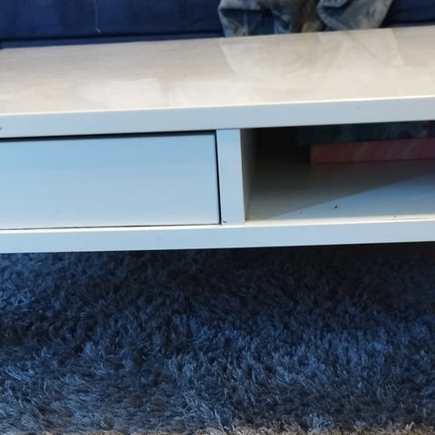 Valkoinen sohvapöytä, jossa on suorakulmainen kansi ja alataso säilytystä varten. Pöydässä on neljä suoraa jalkaa ja yksinkertainen, selkeälinjainen muotoilu. Sopii olohuoneeseen sohvapöydäksi tai sivupöydäksi, ja alatasolle mahtuu lehtiä, kirjoja tai muita arjen tavaroita.