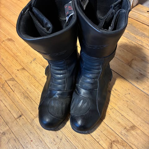 Todella hyvässä kunnossa olevat ajosaappaat. Vedenpitävät. En oikeastaan löydä mitään vikaa, paitsi pienen pieni pintanirhauma toisessa kärjessä (kuva), jonka saa varmasti nahan käsittelyllä piiloon jos siitä ulkonäköhaittaa.