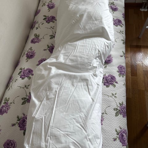 Familon laadukas, isokokoinen vartalotyyny ja tähän sopiva valkoinen tyynyliina. Tyynyä pystyy säätämään täytteen määrällä. Tässä kaikki alkuperäinen täyte tallessa, ei muokattu. Esimerkiksi selkävaivoista kärsivälle todella erinomainen apu. Nouto Espoo Tillinmäki.