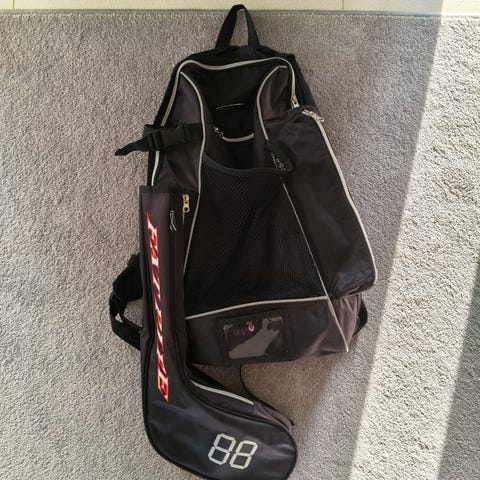 Fat Pipe salibandylaukku. Reppu, jossa useita vetoketjutaskuja ja erillinen tila mailalle. Väri musta–oranssi. Säädettävät ja pehmustetut olkahihnat. Soveltuu salibandyvarusteiden ja muun urheiluvälineistön kuljettamiseen.