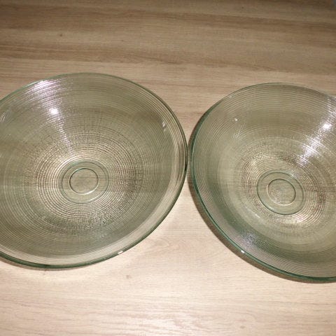 Lasiset tarjoilukulhot, kirkasta lasia. Pyöreässä kulhossa on reunassa kohokuvioitu geometrinen koristekuvio. Soikeassa kulhossa on hiottu koristeellinen kuviointi ja aaltoileva reuna. Sopivat esimerkiksi tarjoiluun, kattaukseen tai koristekäyttöön.