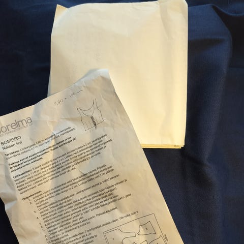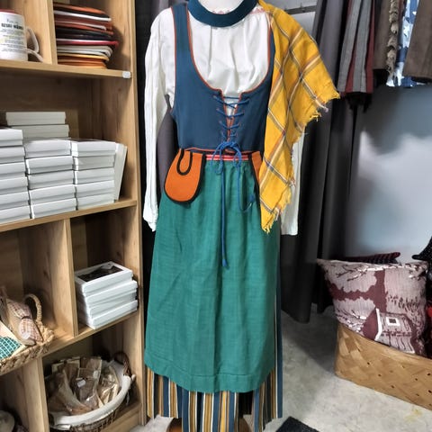 Pus. kai-kai 52 cm, pit. 60 cm, hia 48 cm. Liivin kai-kai 47 cm, pit. 47 cm, vyöt. ymp. 84 cm. Hameen vyöt. ymp. 84 cm, pit. 80 cm. Essu, hop.solki, nauha, sukat. H. 620 e Sarkajakku 250 e. Tarjotakkin saa.