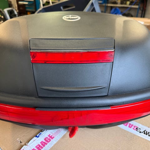 Givi moottoripyörän takalaukku kiinnitystelineellä. Kova takalaukku, jossa punaiset heijastinosat ja Givi-logot. Laukun sisäosa on muovia, ja siinä on kiinnityspisteet sisäremmeille. Mukana tulee Givin pikakiinnityspohja ja teline, joilla laukku voidaan asentaa moottoripyörän tai skootterin takatelineeseen. Soveltuu kypärän ja muun ajovarustuksen tai pienten tavaroiden kuljettamiseen. Väri pääosin musta, hopeanharmaalla ja punaisella yksityiskohdilla.