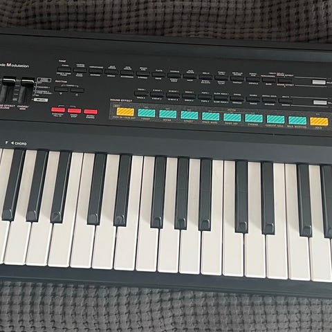 Toimiva soitin: "100 tones + 30 patterns + 10 song bank". Koskettimissa pienet tarrat, saa varmasti halutessaan pois.