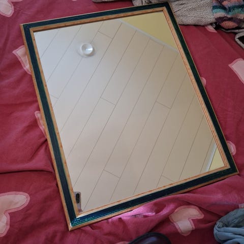 Vanha peili. Ylä- ja alaosan puuosat joskus maalattu, alunperin ruskea.