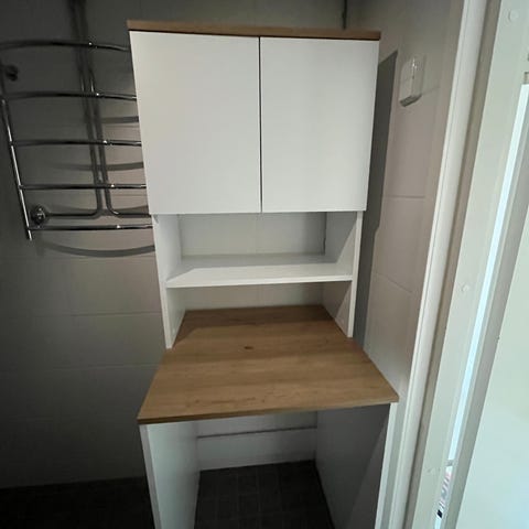 Korkea valkoinen kylpyhuonekaappi, jossa useita hyllyjä ja ulosvedettäviä metallikoreja säilytykseen. Kaappi soveltuu esimerkiksi pyyhkeiden, pesuaineiden ja muiden kylpyhuonetarvikkeiden järjestelmälliseen säilyttämiseen. Ovi on saranoitu sivulle ja siinä on metallinen vedin. Kaappi on mitoiltaan kapea ja korkea, joten se mahtuu pieneenkin tilaan, kuten kylpyhuoneeseen tai kodinhoitohuoneeseen.