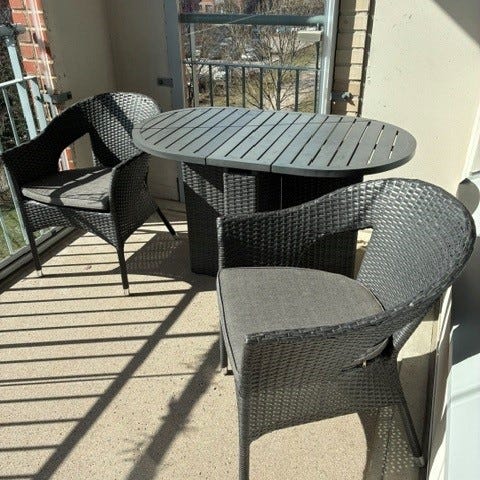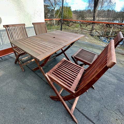 Asko Classic Garden -ruokailuryhmä ulkokäyttöön. Ryhmään kuuluu suorakaiteen muotoinen harmaa pöytä ja kuusi mustaa tuolia. Pöydässä on suoraviivainen metallirunko ja laudoitettu kansi, joka soveltuu terassille tai puutarhaan. Tuoleissa on metallijalat ja kuppimallinen istuinosa. Ryhmä on tarkoitettu ulkokäyttöön esimerkiksi ruokailuun tai oleskeluun terassilla.