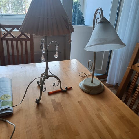 Kuvan mukainen pöytälamppu. Lamppu heijastaa ylös ja alas valoa. 3 lampun paikkaa. Yläpuolen pleksissä pieni naarmu. Lampun alla lukee Airam. Korkeus n. 57 cm ja lampun leveys n. 35 cm.