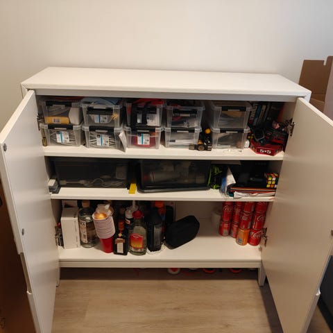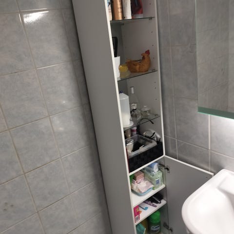 IKEA kaappi peiliovella. Kapea, korkea säilytyskaappi, jossa useita hyllyjä sisäpuolella. Kaapin runko on valkoinen ja ovessa on täyspitkä peili. Soveltuu esimerkiksi vaatteiden, kenkien tai muiden pientavaroiden säilytykseen eteisessä, makuuhuoneessa tai muussa tilassa, jossa tarvitaan sekä peiliä että säilytystilaa.
