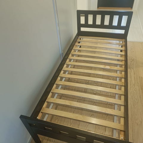 Myydään sänky, jossa mukana kaksi tilavaa säilytyslaatikkoa.